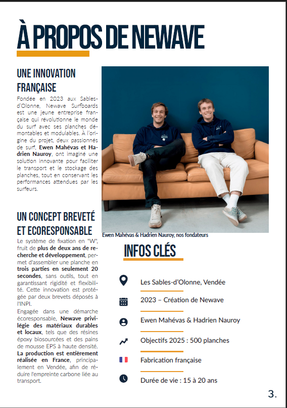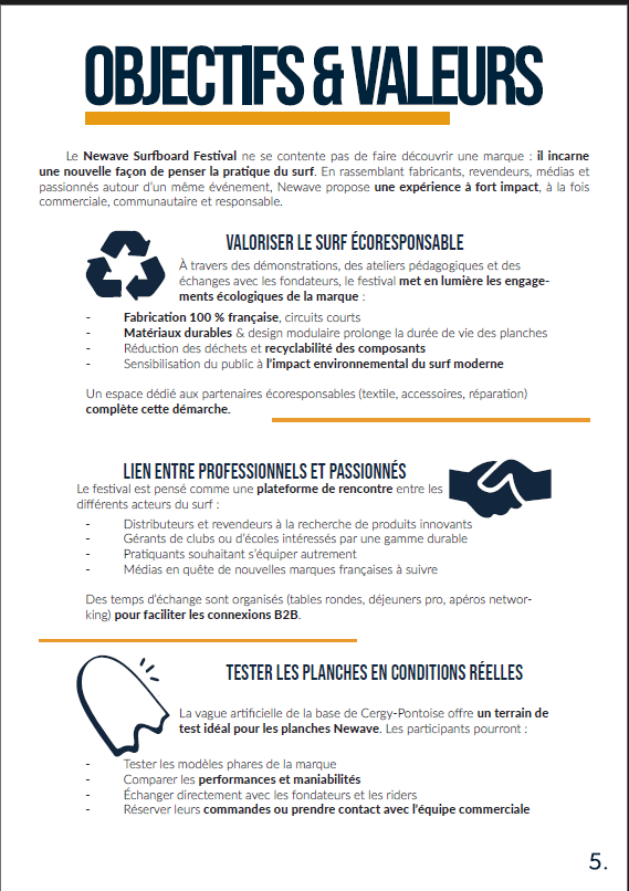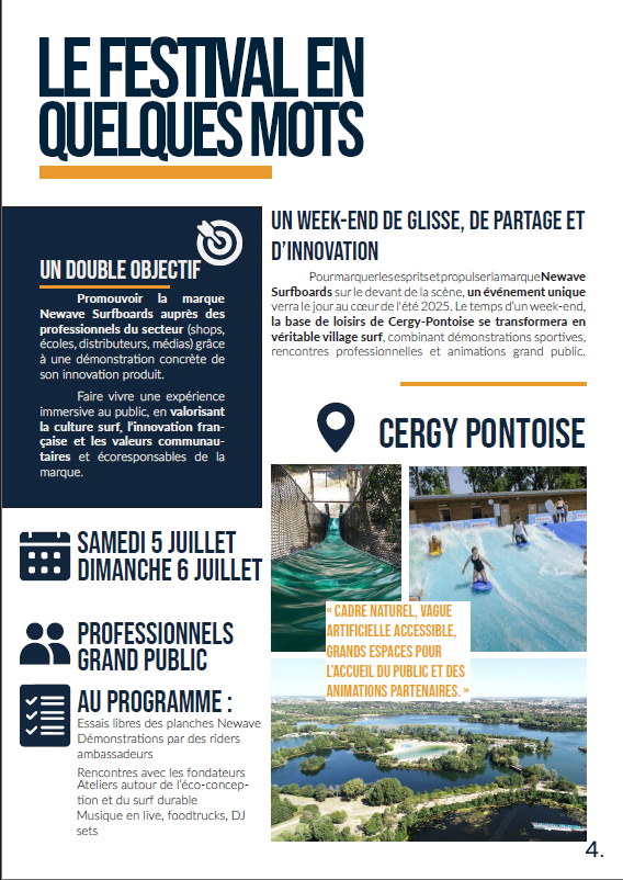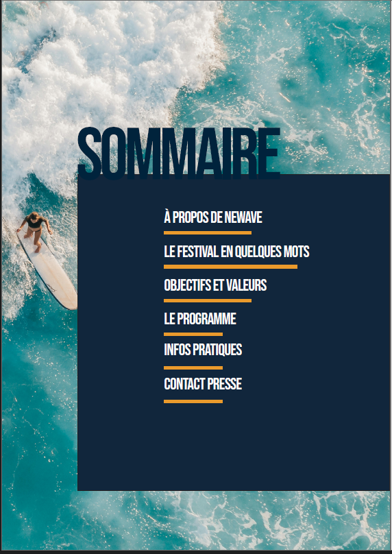Pour ce projet, j’ai réalisé un dossier de presse complet sur Adobe InDesign, imaginé autour d’un festival fictif organisé par la marque Newwave Surfboard. L’objectif était de structurer un document professionnel, clair et attractif, destiné à la presse et aux partenaires potentiels.