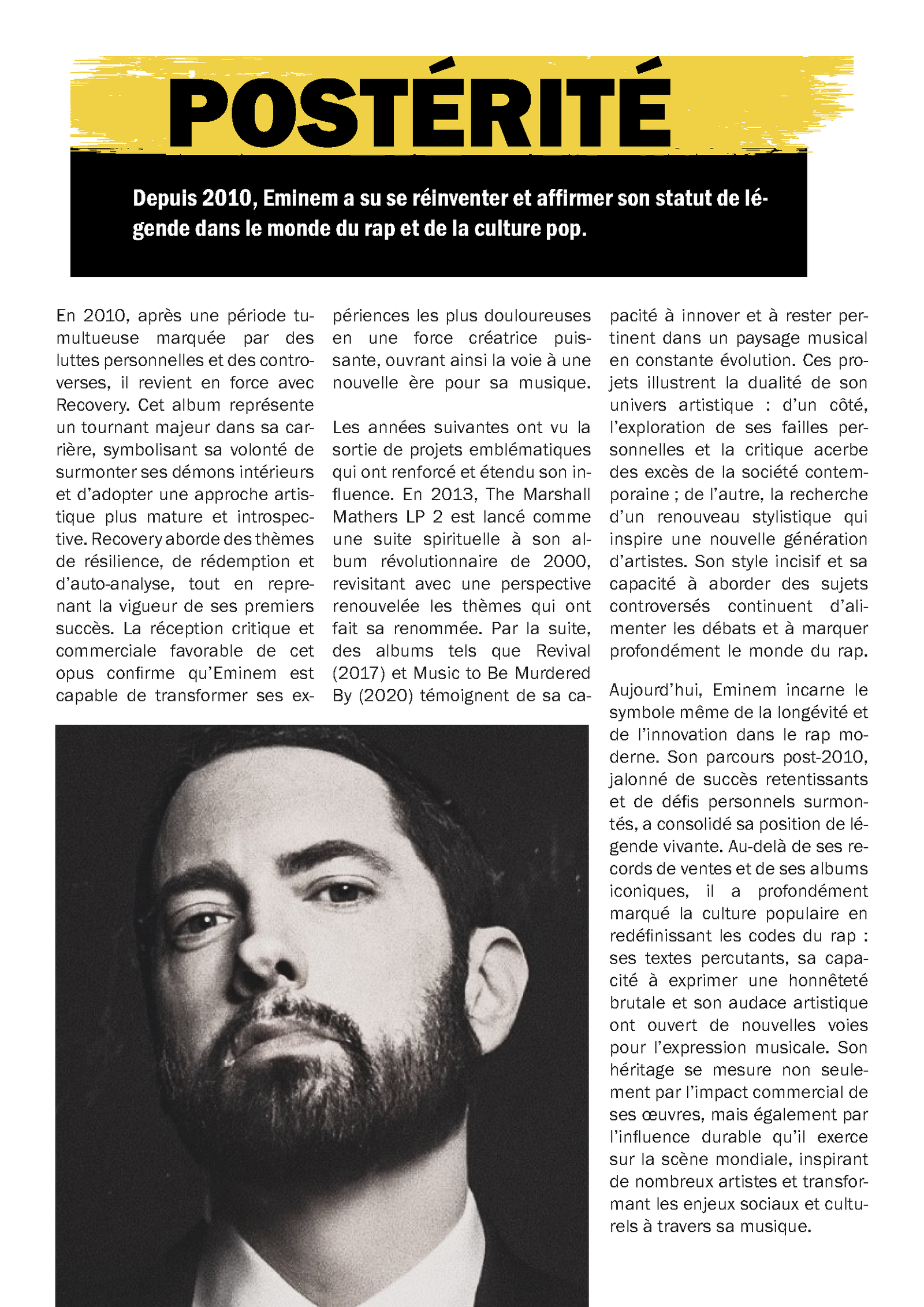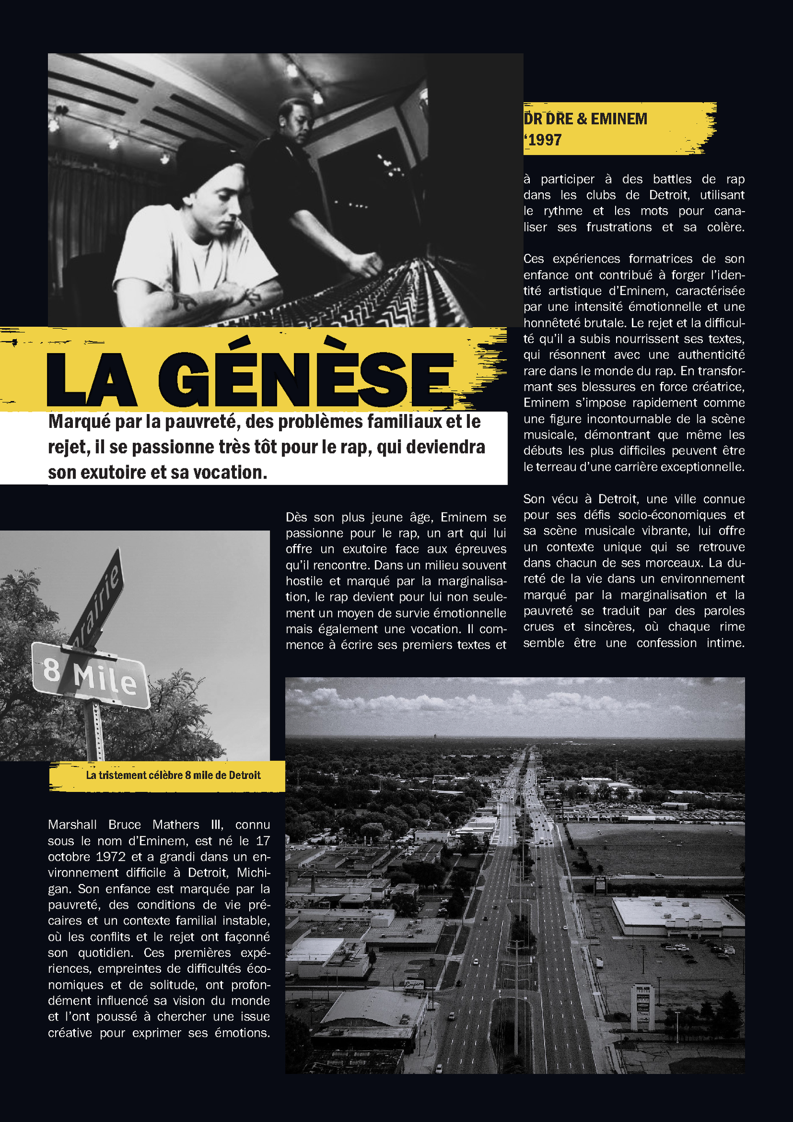 Dans le cadre d’un exercice de mise en page, j’ai conçu un magazine dédié à Eminem, mettant en avant son parcours, sa discographie et son impact sur l’industrie musicale. L’objectif principal était de démontrer ma maîtrise d’Adobe InDesign en travaillant sur la composition, la typographie et l’organisation du contenu.
